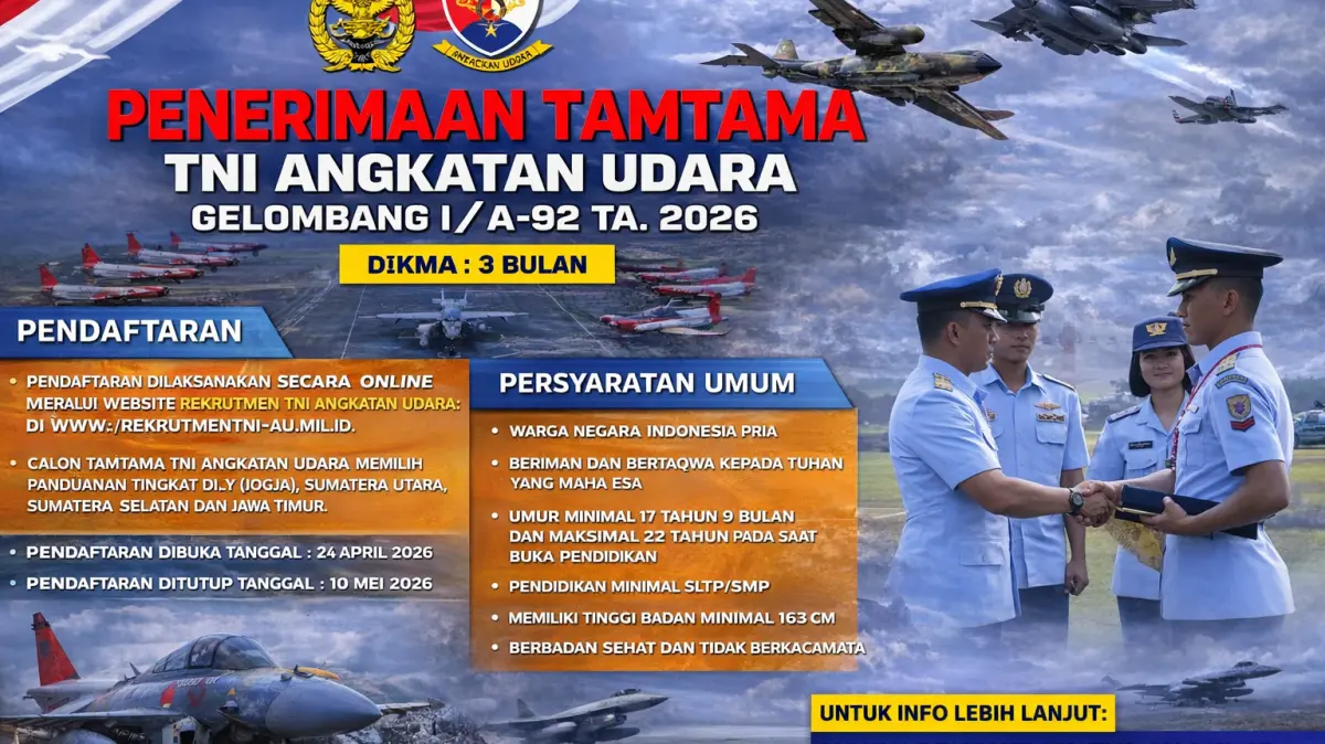 Pendaftaran Tamtama PK TNI AU Gelombang I/A-92 Tahun 2026 secara resmi diumumkan oleh Tentara Nasional Indonesia Angkatan Udara melalui satuan pelaksana di daerah. Salah satunya adalah Lanud Hang Nadim, yang melayani calon peserta di wilayah Kepulauan Riau.